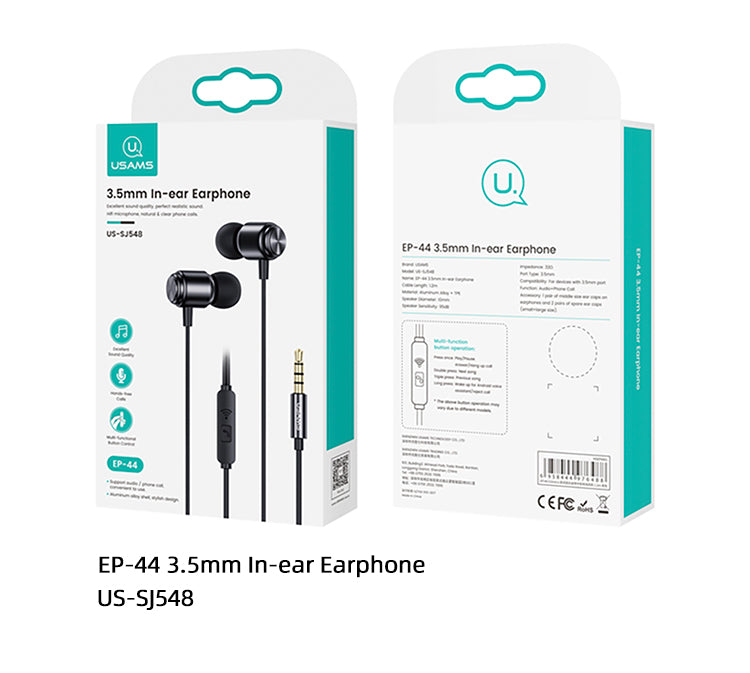 Die USAMS EP-44 3,5mm Metall In-Ear Kopfhörer bieten Ihnen ein herausragendes Klangerlebnis mit stilvollem Design und robustem Material. Diese Kopfhörer kombinieren HiFi-Stereo-Sound mit einem langlebigen Aluminium-Gehäuse, ideal für Musikliebhaber und Vieltelefonierer. Mit einem intelligenten One-Button Control sind sie sowohl funktional als auch komfortabel für den täglichen Gebrauch.