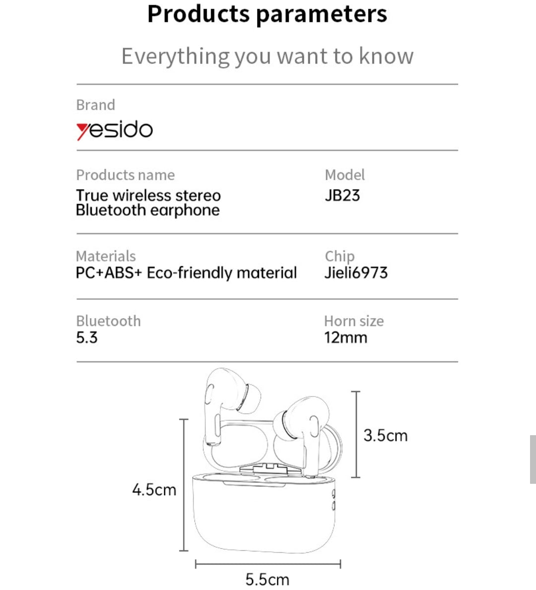 Yesido JB23 TWS Bluetooth-Kopfhörer – Kabelloser Soundgenuss mit Stil