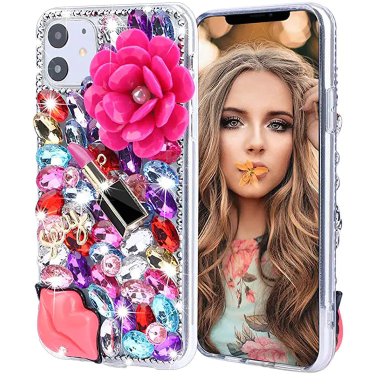 Verleihen Sie Ihrem iPhone einen luxuriösen Look mit dieser aufwendig verzierten Strass Handyhülle. Funkelnde Kristalle, elegante 3D-Blumen und glamouröse Details machen Ihr Smartphone zu einem stilvollen Blickfang – ideal für alle, die Design und Schutz kombinieren möchten.