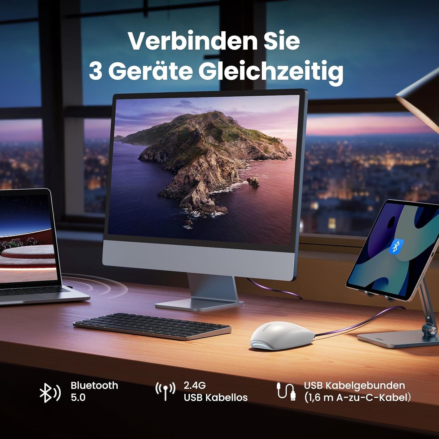 • Es ermöglicht die Verbindung auf drei Arten: drahtlos über Bluetooth 5.0, drahtlos über einen 2,4-GHz-USB-Empfänger und kabelgebunden über ein USB-A/USB-C-Kabel (1,6 m Kabel im Set enthalten).