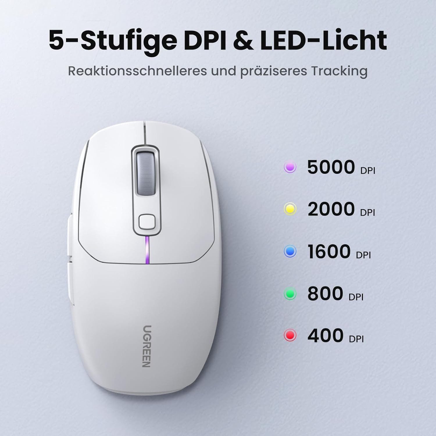 Mit 5-stufiger DPI-Anpassung und LED-Hintergrundbeleuchtung passt sich die Ugreen MU103-Maus Ihren Bedürfnissen an und bietet unübertroffene Präzision und Reaktionsfähigkeit. Perfekt für Gamer und Profis, die Zuverlässigkeit und Geschwindigkeit benötigen.